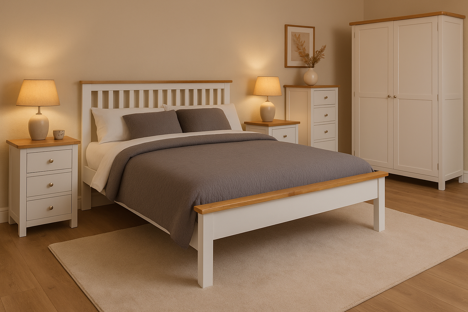 Featured: Daniella 6ft Bedframe, Bedside Locker, and Double Wardrobe with Drawers, styled with our light natural oak herringbone timber floor.