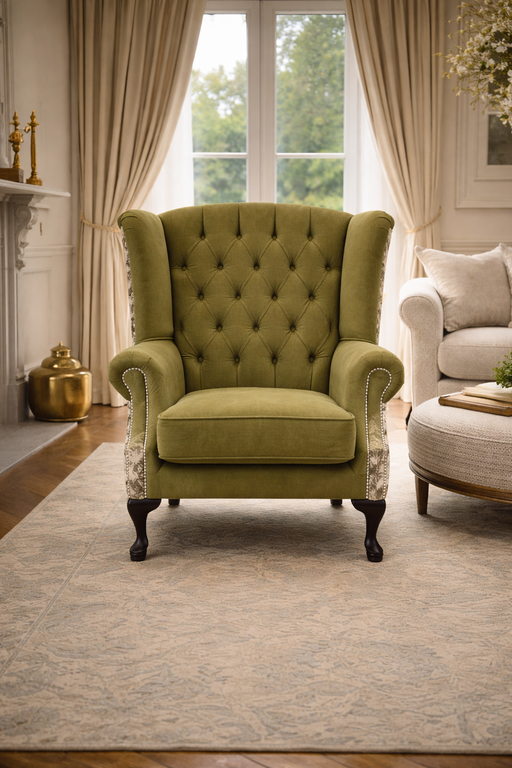 The Queen Anne Chesterfield Armchair in olive green is a timeless statement piece, designed to bring elegance and character to any living space. Fe...
